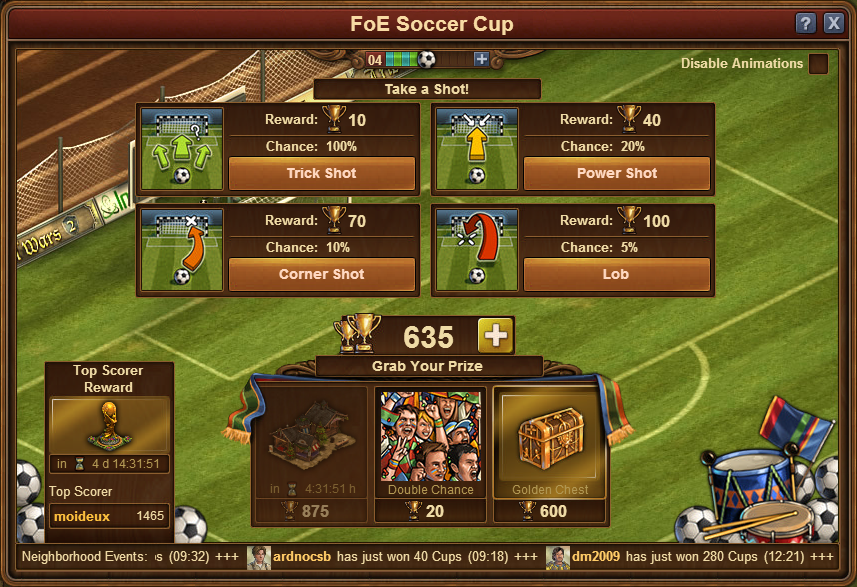 Tiden har kommet! Den viktigste turneringen i Forge of Empires' verden vil starte den 12. juni. Erfarne fotballspillere vil ankomme ditt nabolag for å delta i FoE-fotballmesterskapet! Har du nok mot til å lede din by inn i seier gjennom en utfordrende straffesparkkonkurranse? Hva vil du velge? Et sikkert skudd til moderat suksess, eller vil du velge en mer sostifikert og risikofull - men potensielt mer profiterende - vei? Valget er ditt, manager!